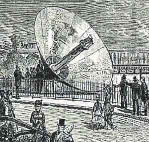 engine, powered by a parabolic sun mirror, generating steam in the